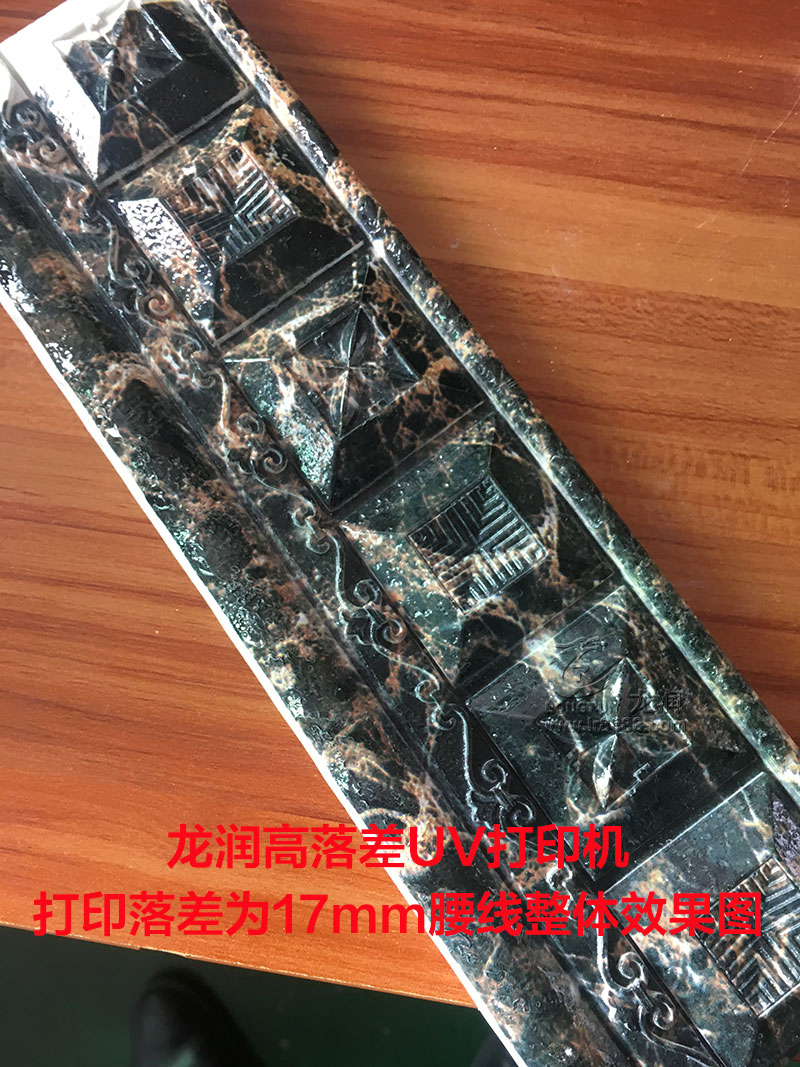 我們隨機抽取了一塊樣品進行打印,打印出來后整體效果還算滿意,客戶也能認(rèn)可,然而我們那尺子測量該腰線的落差高度,才知道該腰線落差高度已經(jīng)達到了17mm,比我們之前測試的15mm樣品還要高2mm,然而看細(xì)節(jié),發(fā)虛并不嚴(yán)重,也沒有嚴(yán)重飛墨的情況出現(xiàn),整體效果已經(jīng)是能達到客戶的需求。